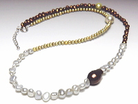 グレーカラーのアコヤ真珠とショコラーカラーの黒蝶真珠、 そしてホワイト&ショコラ&ピスタチオグリーンカラーの淡水真珠・・・ それぞれの真珠が見事に融合し、神秘的で唯一無二の美しさを生み出しました。 真珠一珠一珠が違った表情を見せるナチュラル感がとても素敵な仕上がりです。 グルグルと3重にして着ける、メンズ用としてもレディース用としてもご使用いただける (男女兼用)、今までに無いスタイリッシュなフォルムのブレスレットです。 |