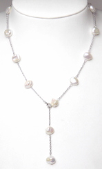計14珠の淡水真珠をチェーンで連結した、スタイリッシュな ステーションタイプ。胸元をエレガントに演出します。長さは 最長約45cmで、留める位置を変えれば3段階に長さ調節も 可能。フロントで留めるとY字タイプのネックレスに早変わり! 多彩なアレンジが楽しめて、重宝すること間違いなしです。 キラキラとした艶やかな輝きと個性的でスタイリッシュな ケシ系のナチュラルな形がとても魅力です。この新しいテイストは、 トレンドファッションにも最適♪大珠サイズの11~10mm。 一般的な白蝶真珠のケシ珠よりも大きく、存在感あふれる 仕上がりです。 |