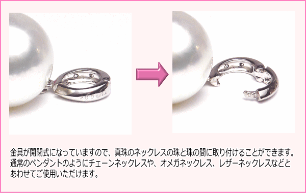■クリッカーペンダントトップの金具:K18ホワイトゴールド製(真珠サイズが8.5mm以下の真珠ネックレスに取り付け可能です。)