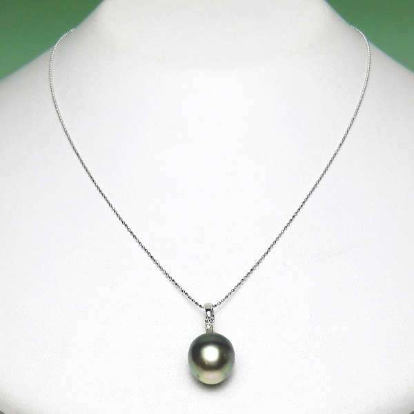 K18WG黒蝶真珠ダイヤ入りペンダント(グリーンカラー/10mm/チェーン有無選択可)